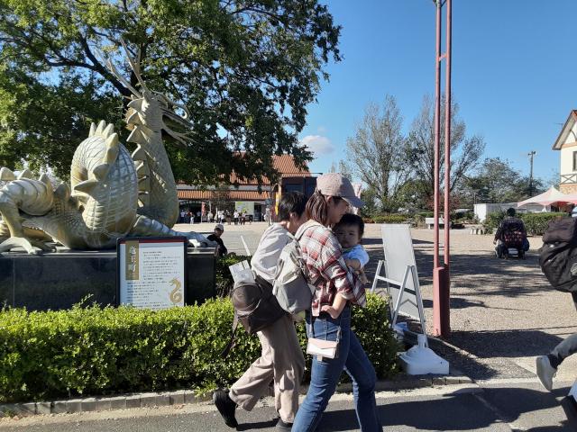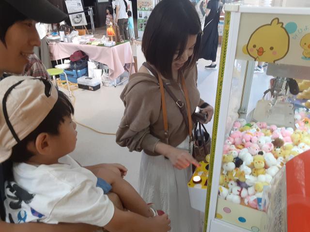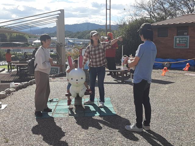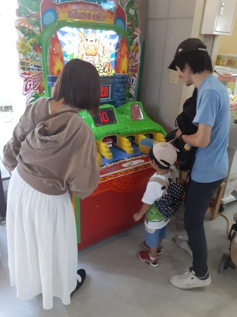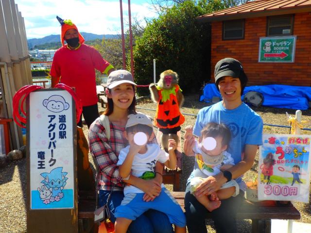 「お猿のうめちゃんの輪投げ」をさせてもらったあとの記念写真。廉彩一家。