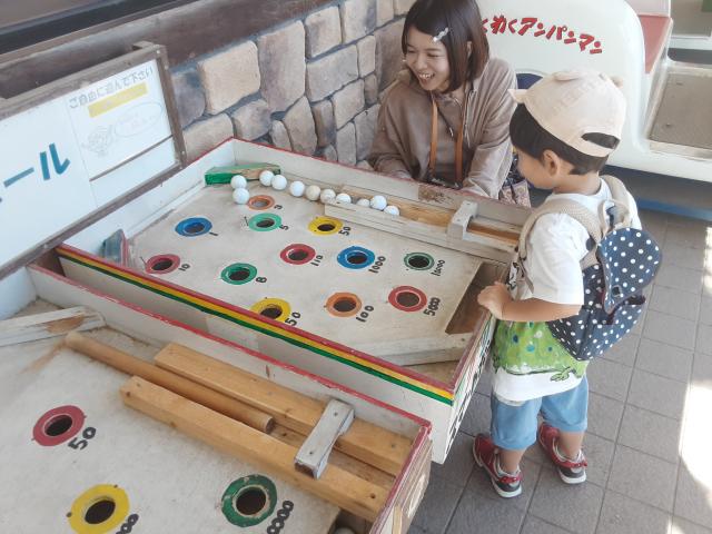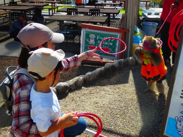 輪投げ1回分(5つ)300円しか払ってないのに、2回もさせてもらう大サービス。記念写真の後ろで、がんばっていいポーズをとってくれているお猿のうめちゃん。