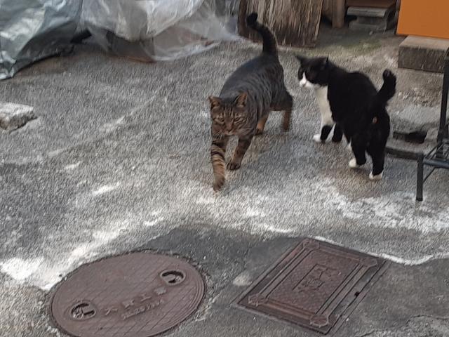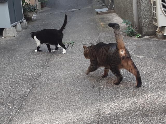 今まで、ハチワレ一族とぱ行一族を同時に見たことがなかった。同じところをねぐらにしていても、仲が悪いのかもと思っていた。