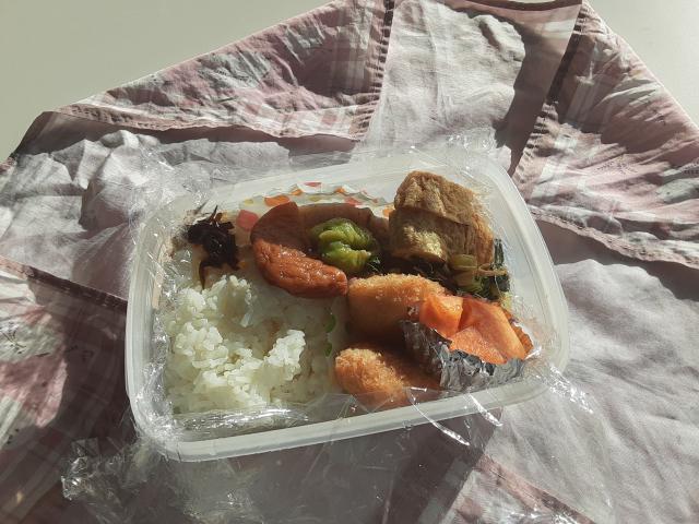 「お弁当の写真がヘた。おいしそうに見えない」とますみさんに言われたので、今日はギャラリーの展示台をお借りしてその上に置いて撮影。