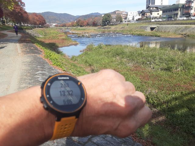 出雲路橋までの2.45km、12分54秒。5分15秒ペース。