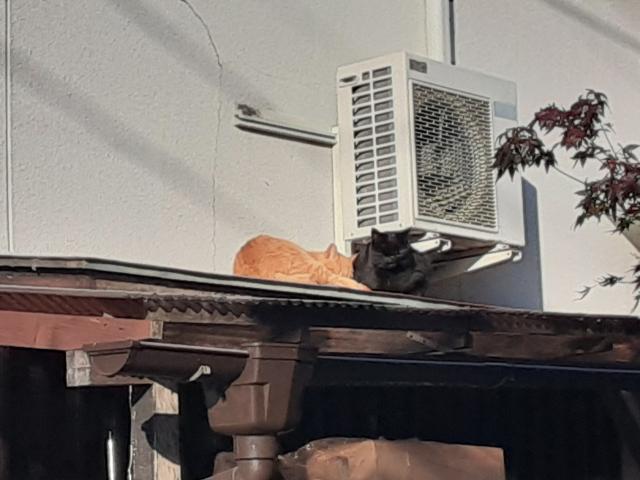 その行きし、ぴゅーたとくろちゃん。いつぶりか知らん、新築のお向かいのひさしの上。そのおうちにはワンちゃんもいるのだが、やっと慣れてきたのか。