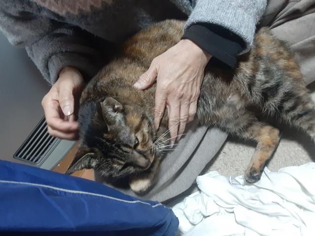 だんだん触れるようになって、いつの間にか普通になでられるようになった。この時で推定4歳。