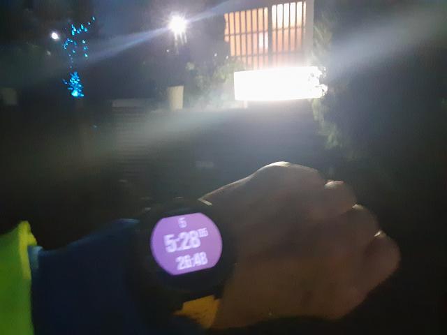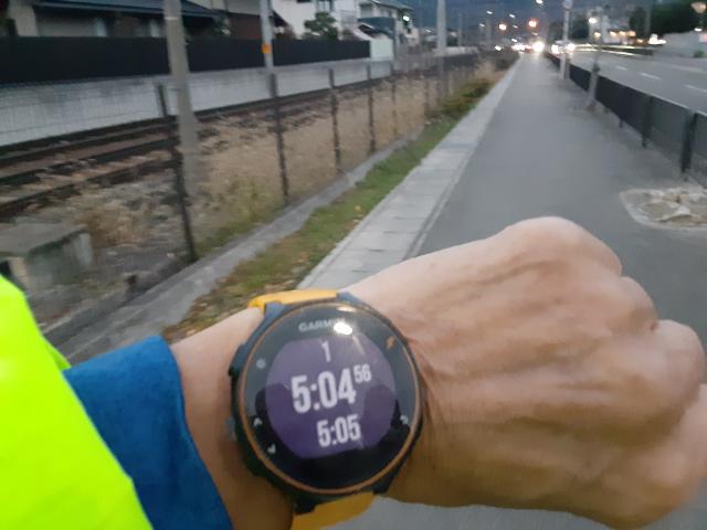 勢い込んで走り出し、最初の1kmは5分04秒。
