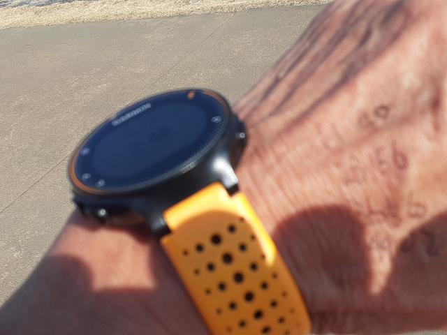 前回のタイムをほとんど覚えていないので、左手の甲にいつもの4分割のタイムを書いておいた。それぞれ10秒縮めると、今日の目標は達成できる。