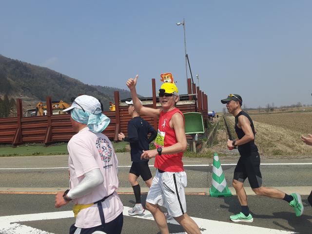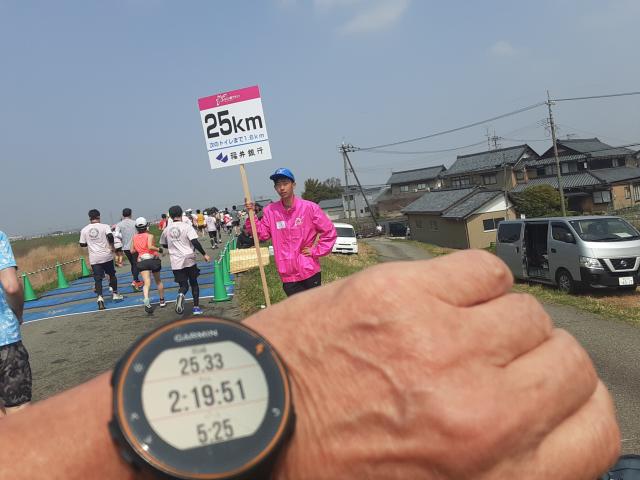 30kmをちょっとすぎたところで、「パオパオさんですよね」と声をかけてこられる方あり。「ランナーズ9の会」のTシャツしか着ていないのに、よく分かったもんです。