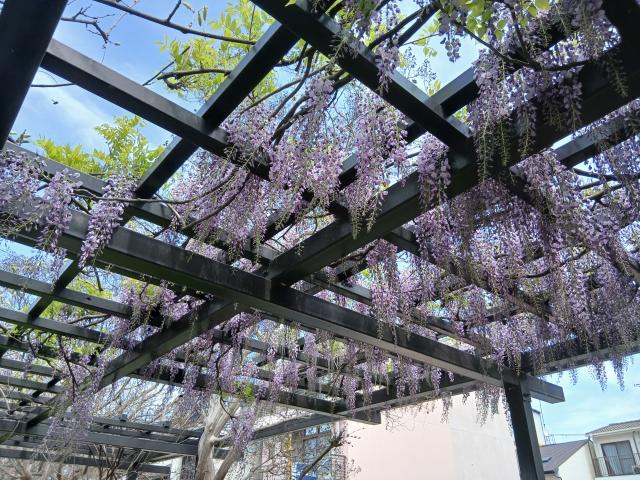 藤は頭の上の位置に咲いているので、あまり気にしなかった。でも今日の巡回で藤棚を見上げている人があり、「ああ知らん間にこんなになってたんや」と確認。