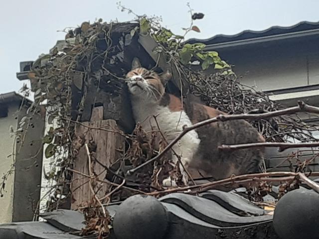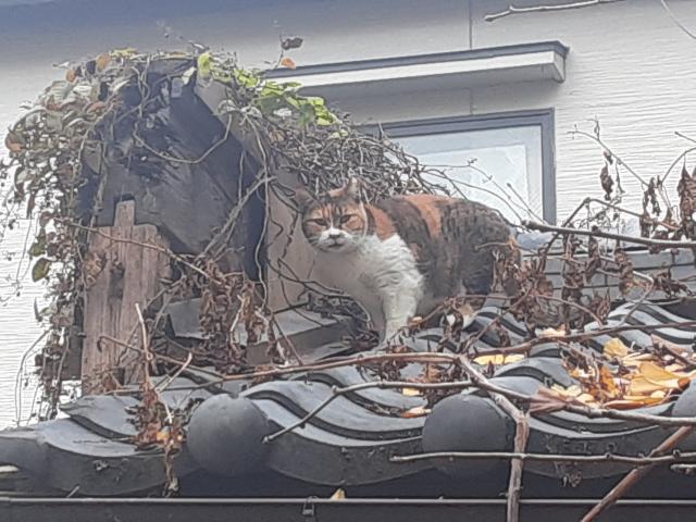 瓦屋根を見上げると、堂々たるミケちゃん。