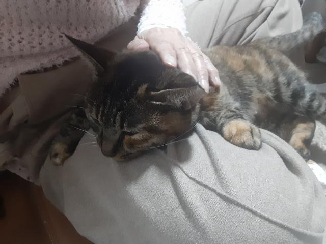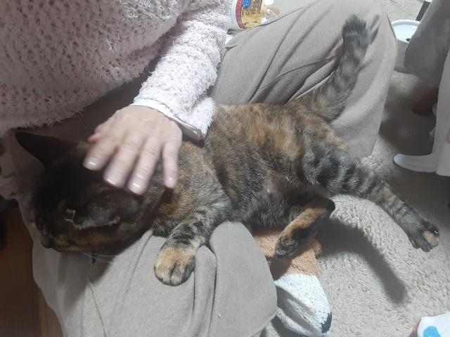 だんだん触れるようになって、いつの間にか普通になでられるようになった。この時で推定4歳。