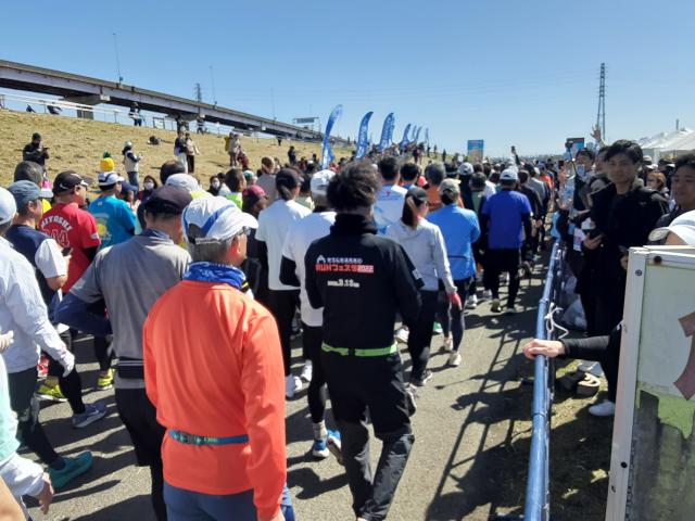 スタート前、前日の「赤羽マラソン・ハーフ」で痛めた左足甲の痛みが最悪で不安だらけの顔。(笑ってますけど。)