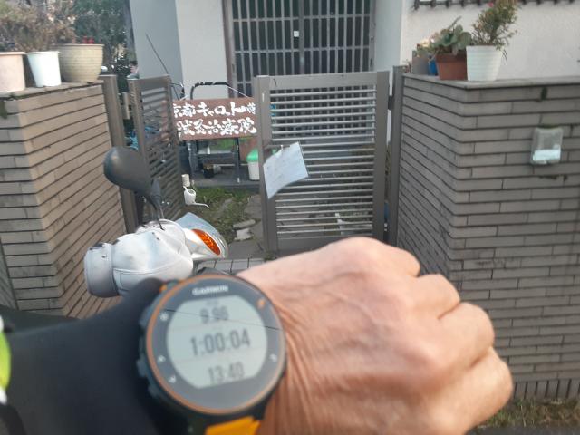 我が家到着9.96km、1時間00分04秒。
