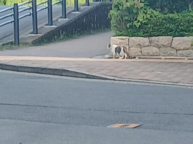 仕方なく、正門前に荷物を下ろしてバリカーを開ける。それが終わって荷物をとりに行ったら、そこにさっきの猫が。目を真ん丸にしていた。