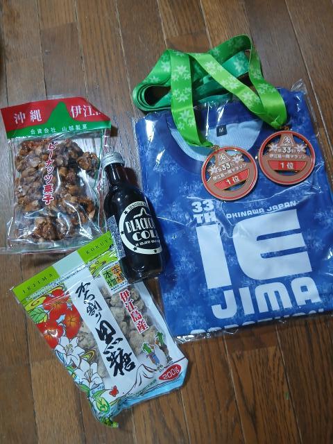 「伊江島マラソンは、3km13分30秒、5km23分59秒で優勝してきます。2種目タプル優勝できたら、豪華おみやげ買ってきます。」